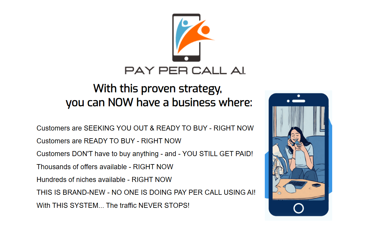 Pay Per Call AI is a brand-new training that helps you make money with pay-per-call marketing. This is an effortless income-generating system that seamlessly integrates: Precisely targeted, cost-free traffic. The influential capabilities of AI. An innovative marketing strategy that defies convention.